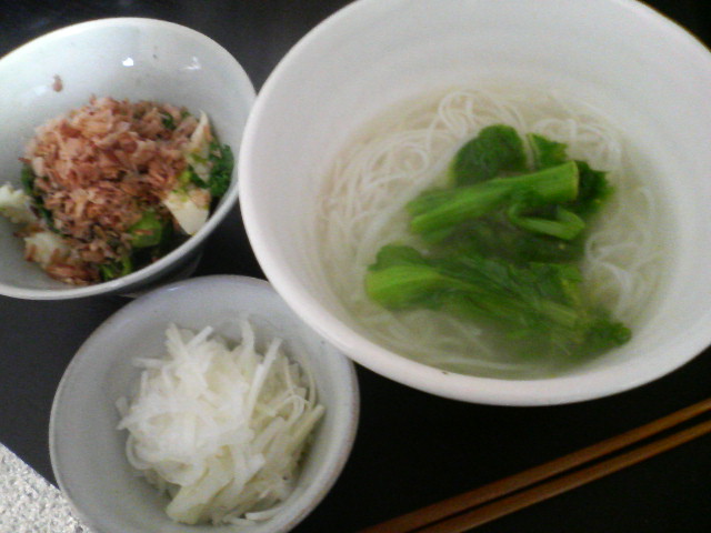 【うちゴハン】シンプルなフォー菜の花乗せ・大根のマリネ・菜の花とイカのからし和え