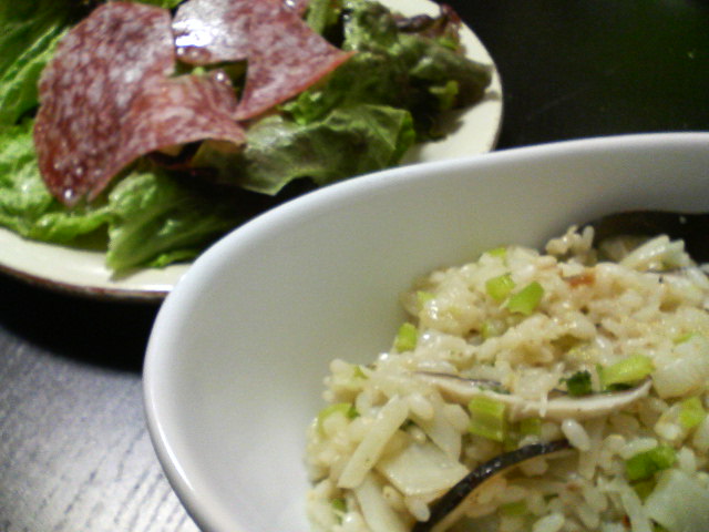 【メニゥー:かぶとしいたけのリゾット、サラミとサニーレタスのサラダ】