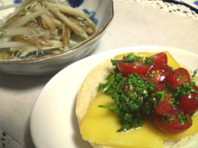 トマトはマリネして、きちんと冷めたらパセリを入れてまぜまぜ。イングリッシュ・マフィンに、ややスモークが効いたチーズを乗せて、トマトのマリネをトッピング。