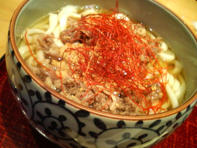 見た目もあざやかなうどんです。すっきりしたつゆに、うどんが入り、濃厚なゴマだれと肉がまったりと乗っています。その上に糸唐辛子でトッピング。プレゼンテーション完璧。