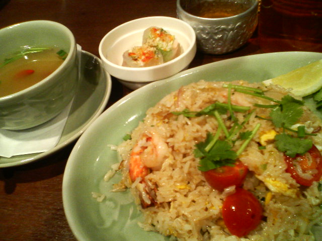 タイ式チャーハン。ジャスミンライスが香ばしくて旨っ♪気前良く乗っているエビとプチトマトの彩りも素敵です。備え付けの調味料で自分好みの味にしあげていただきまーす。