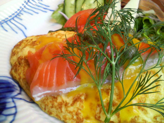 【メニゥー】オムレット+サーモンマリネのトッピング、サラダのブランチセット(1990円)+スパークリングワイン1本で合計5000円也。