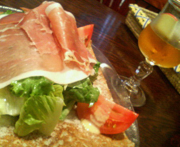 季節のガレット、ということで、シーザーサラダの生ハム添えをトッピングしたものをオーダー。たまには朝からお酒もいいよね、と思ってアペリティフにコルセールをオーダー。んん、おいしい。クーっと飲んでしまいたいところですが、グッとこらえてちょっとずつ。シードルって意外にまわるの早いもんね。