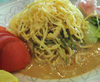 暑いときはやっぱり冷やし中華だよね。ごまだれ大好きなので、迷わずこれに決定。ごまだれ冷やし中華といえば、新宿駅の京王モール内にあるちっさいラーメン屋さんのが非常においしいです。店の名前すら知りませんが、私はその店でごまだれ冷やし中華に目覚めたんですよねー。