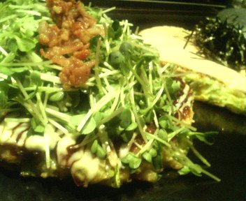 かいわれのしゃきーんとした食感とふわっふわのおこのみのマリアージュ。明太子ソースと、表面がぱりんぱりんに焼けたもちチーズ入りの生地のミクスチュア。おいしーおいしーと言いながら、たくさん食べてしまいました。ダイエット中なのに…!!