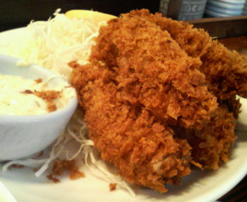 うおー!ひとつひとつがカニクリームコロッケ(しかもLサイズの)のようだ!お約束のようにひと口目で上アゴをやけど。うん、これもカキフライの醍醐味ですな!痛いのはイヤなんだけど、なんだか「熱いもの食べた!」っていう自己満足に陥ることができるので、たまにはヤケドしてみてもいい…かも。カキフライは大ぶりかつミルキーでした。