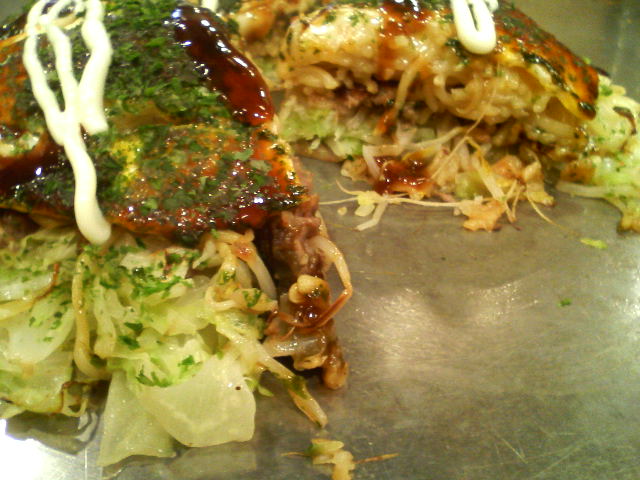 そうこうしているうちに出てきたのは、生地の薄い牛肉+そば入り広島焼き。断面図がキレイでしょう?キャベツが甘いのなんのって、もうフワフワーって気分??ソースはおたふくの甘いほうでした。私、お好み焼きを食べるときだけマヨネーズが大好きなので、健康にはあまりよろしくないのですが、にょろーっと出して食べましたよ。ああ、キャベツがあまーい♪やっぱり広島焼き、好きだなあ。今度はフツーに豚玉でもいいかも?それとも豚玉にキムチをトッピング?うーん、どっちもおいしそう…。飯田橋の「れもん屋」もおいしいんだけど、ガツン!とした味とボリュームで、赤ヘル軍団が好きな男性が好みそうな味かな?いや、私も大好きなんだけど!どちらかというと、くるみ屋は女性向けの味かな?ちょっと優しい味とボリューム。れもん屋よりはまったりゆっくりできそうな雰囲気です。おいしかったです。ごちそうさまでしたー。