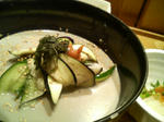 いりこの色なのか、灰色の汁。そこに、なすときゅうりのスライスが。初めて冷汁を食べるという人はドキドキしてしまうのでは、と余計な心配をしたくなるようなビジュアル。でも口に入れてみれば「んーまー」と声が出るに違いなく。どことなくクリーミーなのは、すりゴマの風味かしらん?先日のかき揚げっぽいだし茶漬けも良かったですが、こちらもかなりおいしかったです。冷汁バンザーイ♪本場では夏のスタミナ食らしいですが、冬場でもおいしいと思います。ポイントカードもらったから、また行こうっと。