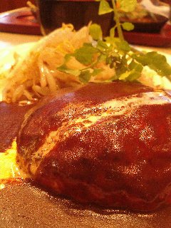 んーんー、おいっしー♪つけあわせのもやしがしゃっきしゃきで美味しいです。もりもり食べられます。で、ハンバーグ。お箸を入れるとじゅわーって肉汁が!じゅわーって。この際カロリーがどうのこうの考えるのは野暮というものです。いや、むしろ無視です。(←デブの王道)。