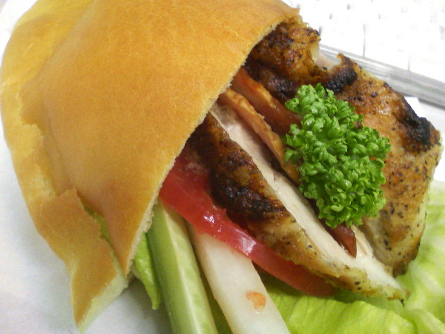 どーです。ボリューム感。ペッパー風味のローストチキンと野菜スティックがピタっぽいパンにどかーんと詰めこまれているのです。見た目もウツクシイし、ローストチキンはカロリー低めだし、野菜もたっぷり入っていて言うことナス。大口開けてかぶりついたところ、具ぜーんぶのおいしさがジュワーっと飛びこんできました。うーん、大ヒット作品。