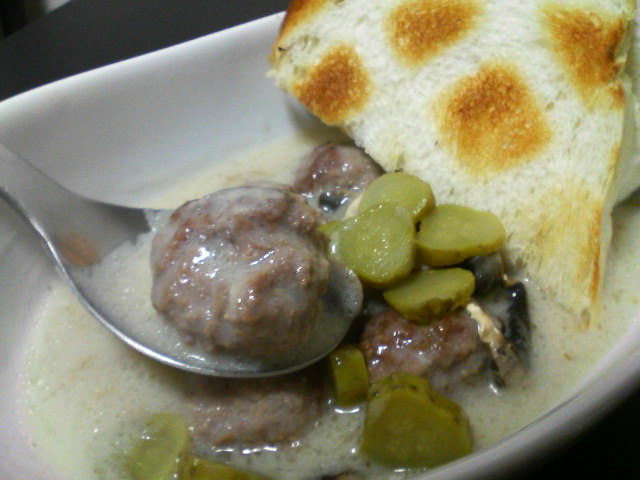 というわけで、帰宅して酔いもさめて、お腹が空いたので、スウィーディッシュ・ミートボールを作りました。本当はサワークリームで作るんですけど、家になかったので、フツーにホワイトソースで作りました。